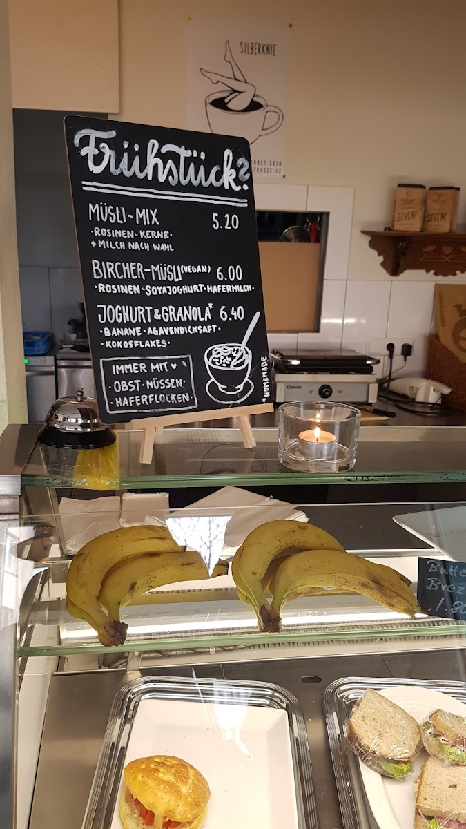 The menu at SILBERKNIE Cafe features a selection of coffee and beverage options including various coffee preparations, matcha latte, and oat cappuccino, catering to different preferences. In addition to drinks, the food offerings include light meals such as sandwiches and lunch dishes with African cuisine influences. Vegetarian choices are consistently available to accommodate different dietary needs.